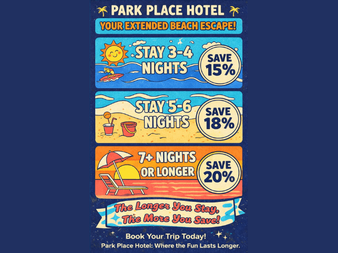 Trade the rush for the tide. The longer you stay, the more you save on your retreat at Park Place Hotel!